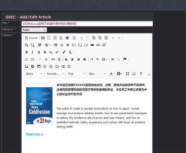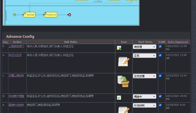 aDVANCE SETTINGS | Admin | 多语言与国际化 Multi-Styles/内置多种风格样式 Actoins/执行任务定义Approve Status/单证状态定义制度/规章发布更多功能介绍请参见 不良事件上报 根因分析 行动计划.