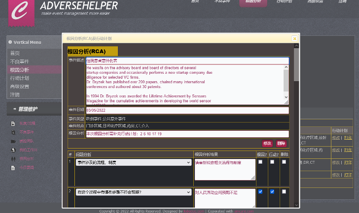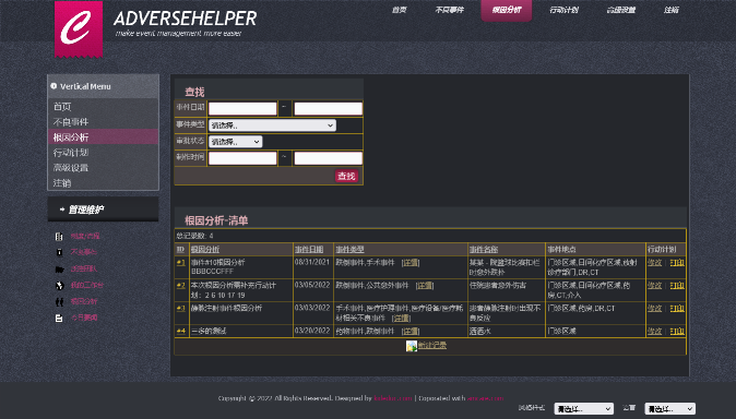 根因分析/root cause analysis | Admin | 根因分析主要目标是从不同维度分析不良事件发生的原因,并对判断为根因的要素项设定行动计划参见 行动计划是指下面是根因分析列表,该列表记录了历次根因分析的相关信息: 需要针对每个分析结果采取一个行动,明确说明行动措施的预期结果、实施日期和如何衡量其有效性 更多关于根因分析的基础设置功能请参见 高级配置